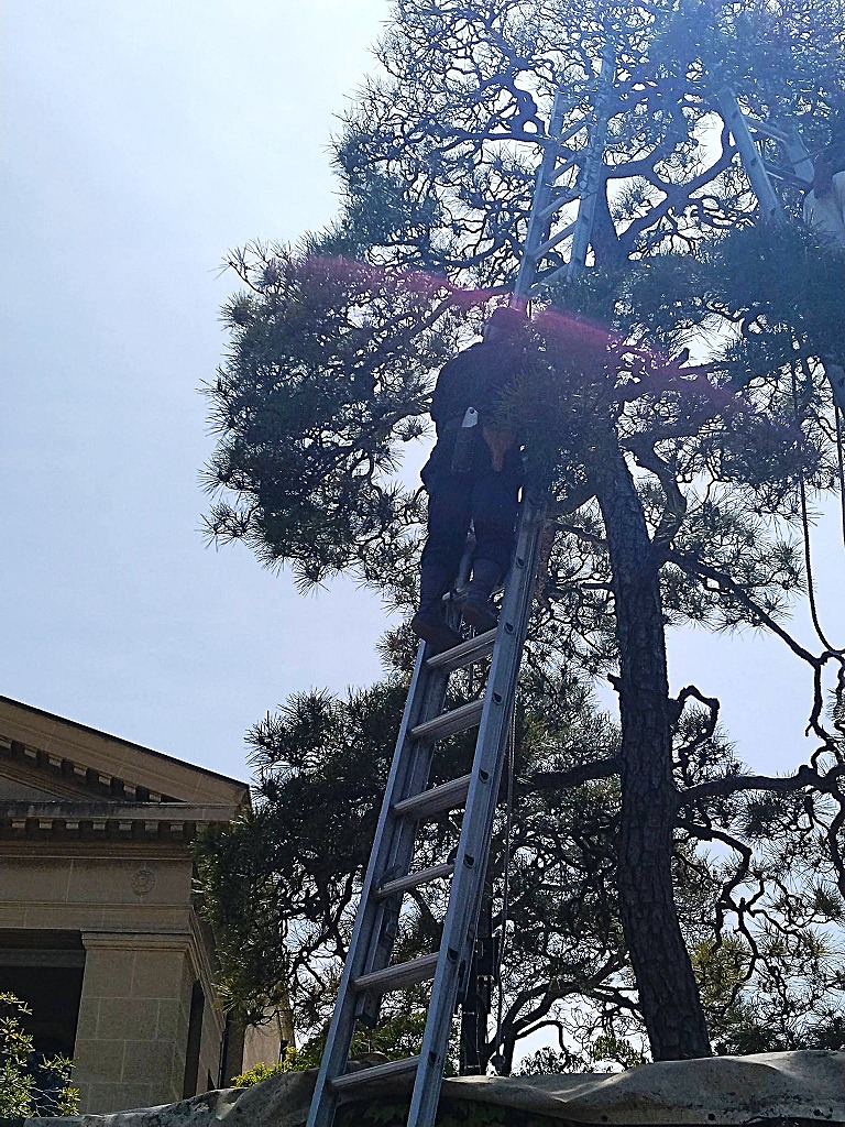 向かいの大原美術館では松の剪定が進んでいます。改修工事のために長く休館していましたが、4/25(土)からオープンです。